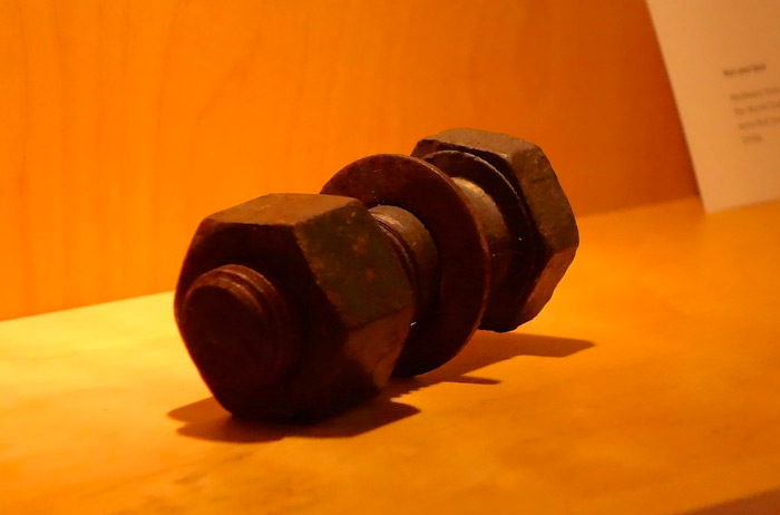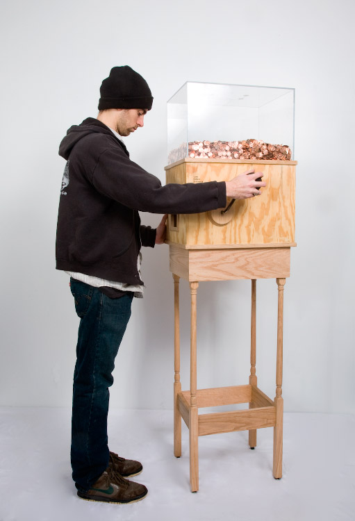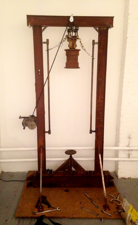 The Coin Press – at the Currency opening and at intervals during the show, Bronwen Densmore and Hackett will operate their guillotine-like, six-foot tall Coin Press, conceived and assembled on the banks of the Gowanus using scavenged materials. The Coin Press drops a heavy weight on real coins of copper and brass, imprinting them with marginally meaningful designs.