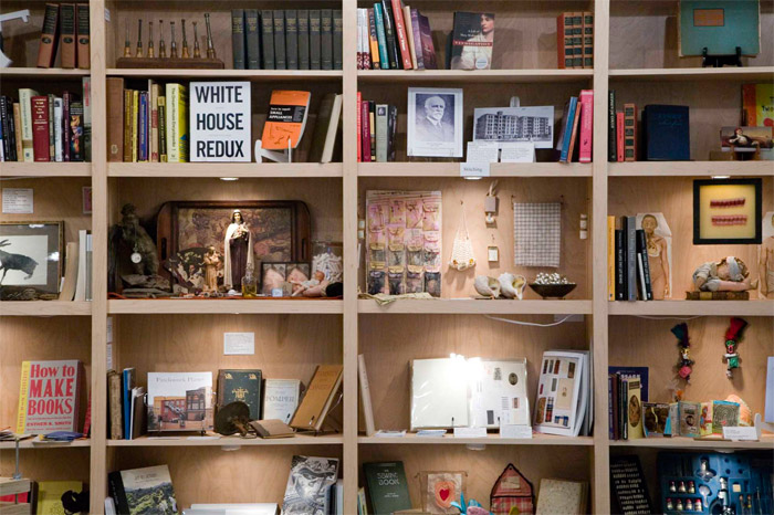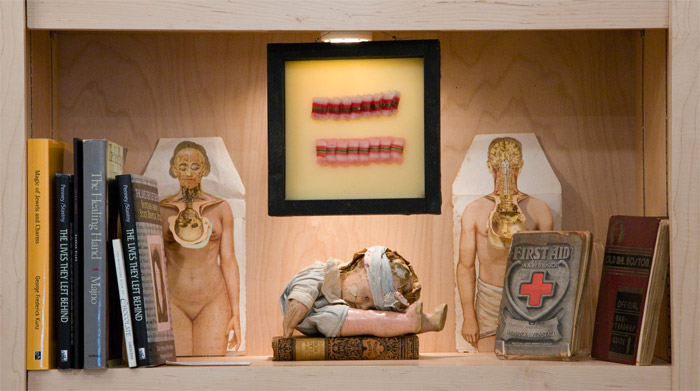 In a culture that increasingly resorts to throwing things away when they break, we began by exploring the disappearing skills and tools of repair, from darning socks and repairing shoes to fixing watches and mending clothing, including stitching, spinning, and knitting. We looked at the methods and tools of saving, recycling, conserving and archiving, from books to household refuse. We looked at art, books and objects related to regeneration of the environment, of the human body (surgery, medicine, death), and of society’s ills, including a library of books about social visionaries.