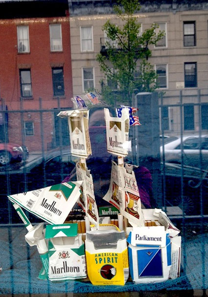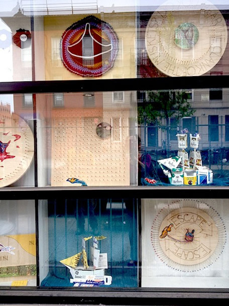 Battle Pass – Revolution I was a collaborative mixed media installation in the storefront window of the Crown Heights art space GRIDSPACE, visible from the street twenty four hours a day. The installation included “battle ship” assemblages made of found objects; a ceramic tricorn hat; a series of black ribbon cockades; and wood panels that included drawn, painted and burned imagery and text from the Walt Whitman poem “The Centenarian’s Story.”