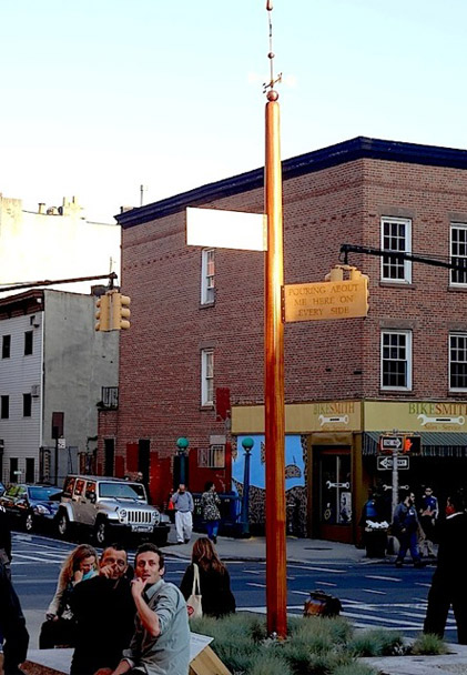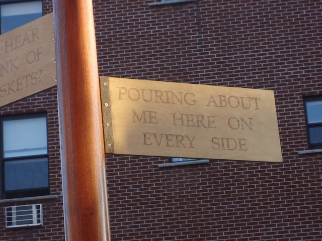 The neighborhood that is now Crown Heights played a decisive role in the Battle of Brooklyn. Fought on August 27, 1776, it was the first confrontation between British forces and the Continental Army after the Declaration of Independence was signed, and more soldiers fought here, in Brooklyn, than in any other battle of the American Revolution. During the war, Crown Heights—or Crow Hill—was a rocky, unsettled outcropping rising above surrounding farmlands. Bedford Pass, located less than a few hundred feet from the corner of Rogers Avenue and Sterling Place, cut through this wilderness. In the summer of 1776, Major General John Sullivan positioned about 800 troops from Connecticut and Rhode Island along Bedford Pass to defend the city from British and Hessian forces camped south of here in Flatbush. Sullivan placed only five cavalry officers at Jamaica Pass, to the east. On the eve of battle, a contingent of British soldiers marched under cover of darkness to Jamaica Pass, where they easily overwhelmed Sullivan’s meager defenses and continued on to the village of Bedford, just north of here. When fighting began the next morning, Sullivan’s troops at Bedford Pass found themselves surrounded and outnumbered by enemy forces, and retreated to the west, toward the American forts in Cobble Hill and Brooklyn Heights. Benjamin Tallmadge, a Connecticut schoolteacher who fought here at Bedford Pass, later recalled that “Before such an overwhelming force of disciplined troops, our small band could not maintain their ground.” The fledgling Continental Army eventually lost the Battle of Brooklyn—a stinging defeat George Washington later attributed to Sullivan’s failure to defend Bedford and Jamaica Passes. Cornered in Brooklyn Heights, Washington and his troops just barely managed to escape across the East River to Manhattan. This public art installation by Sasha Chavchavadze recalls the Liberty Pole, a 46-foot pine ship mast that colonists planted in the ground in Lower Manhattan. Inspired by the British folk tradition of maypoles, the Liberty Pole became a powerful symbol of resistance to British rule and taxation in the years leading up to the American Revolution. Colonists protested taxes like the one imposed on the white pine poles used for ship masts—a protest that caused the “Pine Tree Riot” in New Hampshire in 1772. The pole also suggests the masts of the more than 400 British ships that entered the harbor before the battle carrying 40,000 British troops, described at the time as being “as thick as a forest of trees.” The sixteen-foot mahogany pole at the corner of Smith and Bergen Streets has a metal weathervane affixed to the top; beneath the weathervane are three wooden directional signs pointing in three different directions: towards the Gowanus Canal; towards Manhattan; and towards the corner of Court and Atlantic. Text from Walt Whitman’s poem, “The Centenarian’s Story,” is burned onto the wooden signs. Revolution II is a collaborative initiative with the NYC Department of Transportation, www.nyc.gov/urbanart, and the Boerum Hill Association. Educator Angela Kramer Murphy provided a history of the fortifications built in Cobble Hill before the Battle of Brooklyn. On designated days during the project there will be on-site readings, performances and workshops about the Battle of Brooklyn for adults and children. Paul Benney and other artists will perform at the corner of Smith and Bergen on August 27, the anniversary of the battle. In the spring of 1776, Brooklyn prepared for war; farmers abandoned their homes and fields. Soldiers from other colonies arrived, and built a string of forts from Brooklyn Heights to Red Hook to defend Manhattan from British attack. Cobble Hill Fort stood almost due north of this spot, on a hill that once rose near the intersection of Atlantic Avenue and Court Street. From this vantage point in Cobble Hill, George Washington watched the Battle of Brooklyn unfold on the morning of August 27, 1776. He saw a small band of soldiers from Maryland fight, and die, at the Old Stone House to the southeast—in what is now Park Slope. And he saw his fledgling army, outmaneuvered and overwhelmed by British and Hessian forces, make a hasty, desperate retreat across Gowanus Creek. When the battle ended, Washington’s army was cornered, trapped between enemy troops and the East River in the very forts they had constructed to defend the city. The American Revolution could easily have ended here, in Brooklyn, if Washington had not made a daring escape to Manhattan by boat. Approximately nine thousand soldiers were ferried from Fulton Landing—to the north and west of this spot—and across the East River to safety. Eighty years later, Walt Whitman published “The Centenarian’s Story,” recalling the Battle of Brooklyn in the voice of an elderly veteran—remembering what happened here before these streets and brownstones were built: The years recede, pavements and stately houses disappear. Battle Pass – Revolution III is a collaborative mixed-media installation in the Gowanus art space, Space 2C, marking the Gowanus site of the Revolutionary Battle of Brooklyn. The installation will include “battle ship” assemblages made of found objects; references to the 17th century tidal mill culture; a ceramic tricorn hat and Revolutionary pistol; artist-made battle maps and ribbon cockades; and wood panels that include drawn, painted and burned imagery and text from the Walt Whitman poem “The Centenarian’s Story.” Battle Pass Artists: Paul Benney, Sasha Chavchavadze, Robyn Love, Eva Melas and educator, Angela Kramer Murphy A tide mill once stood not far from where Proteus Gowanus stands today, near the Union Street Bridge. The mill, built by Adam Brouwer before 1661 and later known as Freeke’s Mill, used the power of rising and falling tides to grind wheat into flour. In 1776, the mill’s bridge was the only way to cross Gowanus Cree