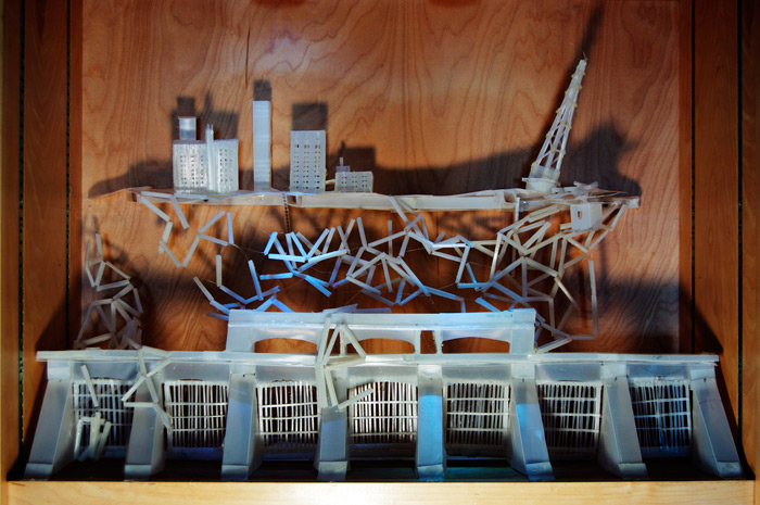 Water Works is curated by Christopher Saucedo, an artist from both Brooklyn and New Orleans who suffered losses in the Katrina flood and in Superstorm Sandy. The show’s title is derived from the board game, Monopoly. It invokes the infrastructures and agencies that deliver water to our sinks and tubs while also serving as a metaphor for tears. Saucedo has observed that the Katrina flood has been “the implied filter through which out-of-town audiences contextualize [New Orleans] artwork.” He compares the “automatic solemnity that takes over when visitors find themselves at the World Trade Center site” to reactions to Katrina and concludes that “As sure as place defines us, place-altering events change us.”