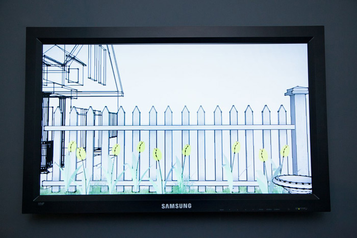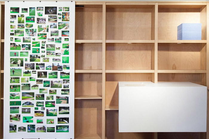 David East’s site-specific installation, Pastoral Double Plot (Non-Circulating) explores the theme of water by referencing one of its greatest consumers—the American suburban lawn. Driven by the idea of the lawn as a sort of parasitic architecture to the suburban home, the piece itself echoes the lawn/home relationship, growing out of Proteus Gowanus’s own systems of display. He will also present A Walk in the Park (thank you Mr. Lynch), within the library stacks, a looped animation further exploring the lawn inspired by the opening sequence of David Lynch’s film, “Blue Velvet”.
