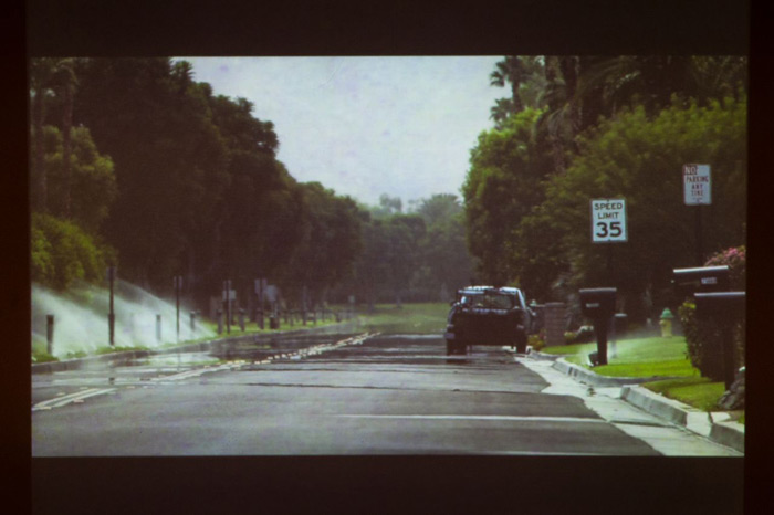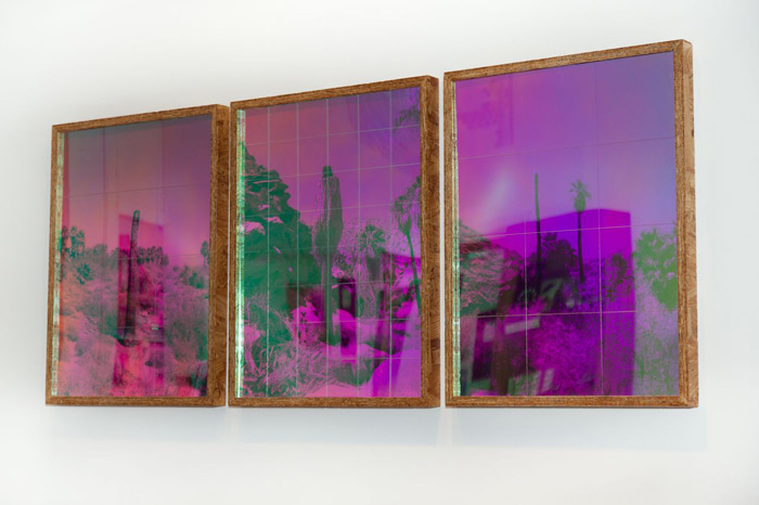 Marget Long will exhibit photographs and video from her current series Mirage Mirage (which, incidentally, grew out of her involvement with the library’s Center City Branch in Philadelphia in 2009.) Daylight at the Oasis consists of three pixelated, black and white photographs of an oasis in the Mojave Desert which are mounted under a dichroic, refractive plexiglass cut into a grid pattern. The specialized plexiglass, marketed by 3M for its ‘mirage like’ properties, causes the oases to change hue, appear, and disappear, depending on the viewing angle. The photographs also reflect the contents of the room in which they are displayed. She will also present Rancho Mirage, a looped video work featuring footage of a mirage interacting with automatic sprinkler systems on a commercial strip of road in the city of Rancho Mirage, CA.